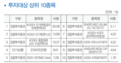 투자수익률이 낮은 이유는 아마 비교적 안전투자 대상인 ‘채권’에 투자가 많이 되어서 인 거 같다. 투자대상 상위 10 종목 중 1~3위가 모두 채권이다.