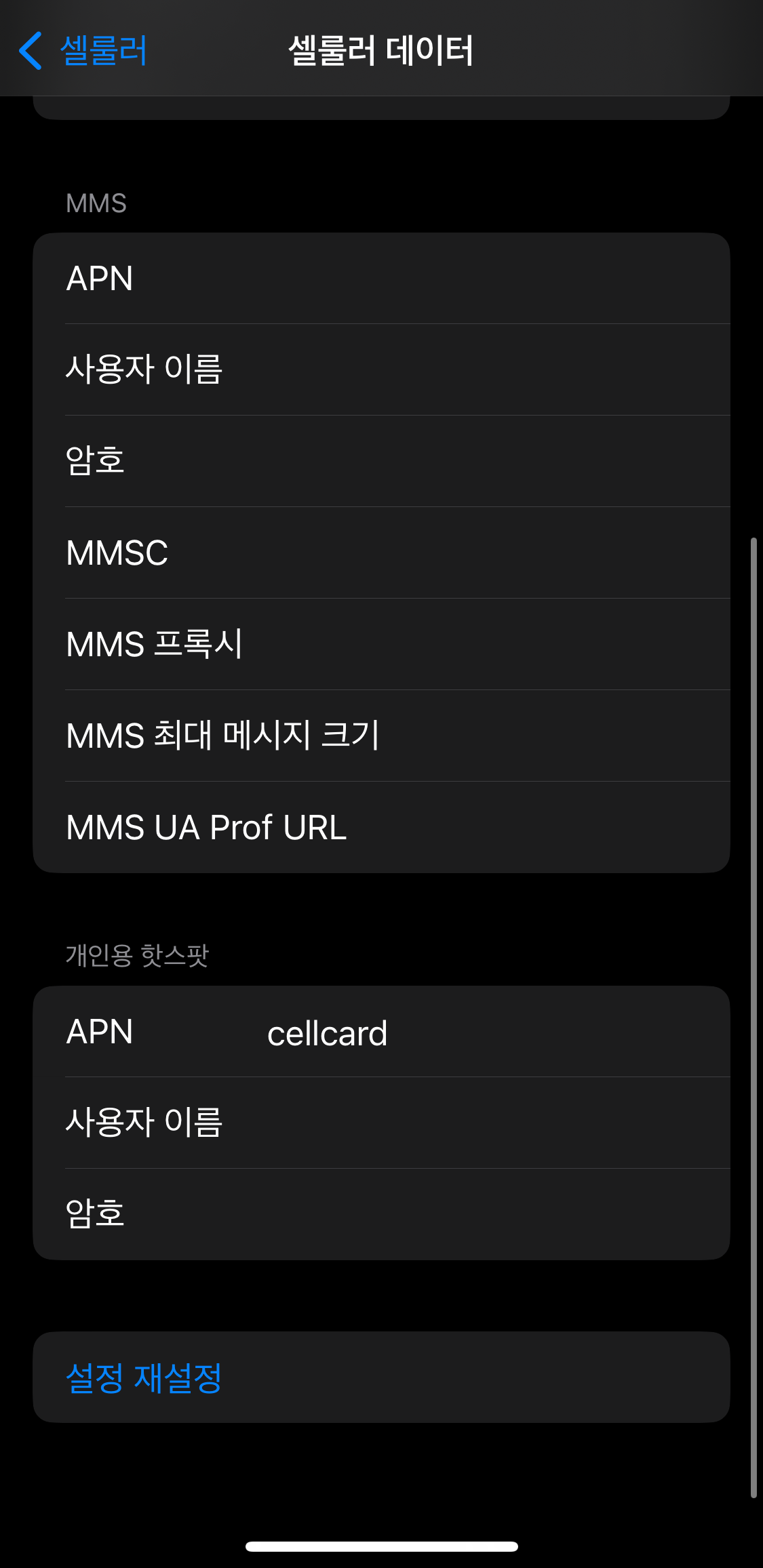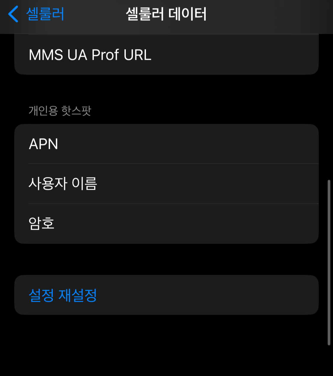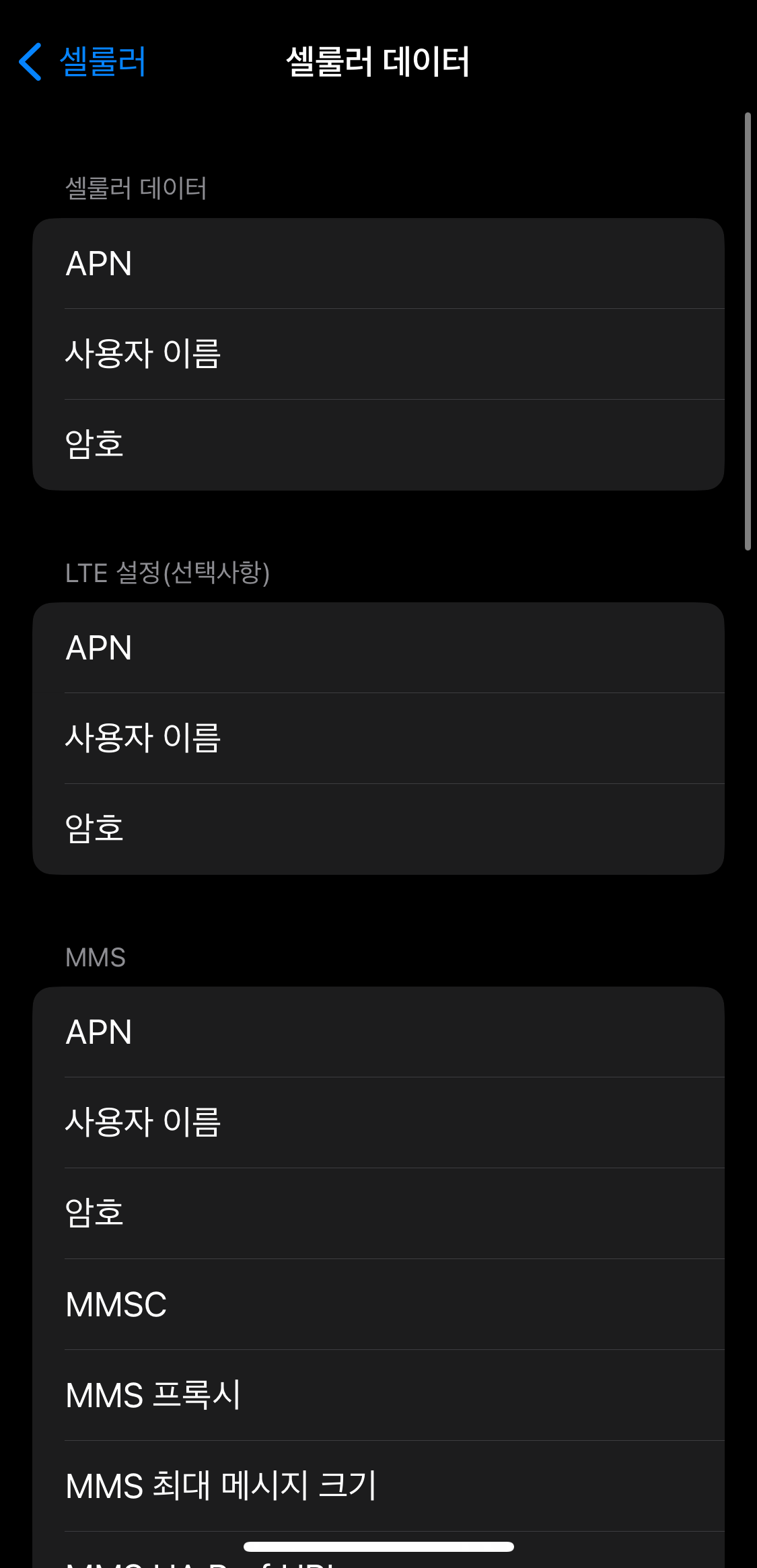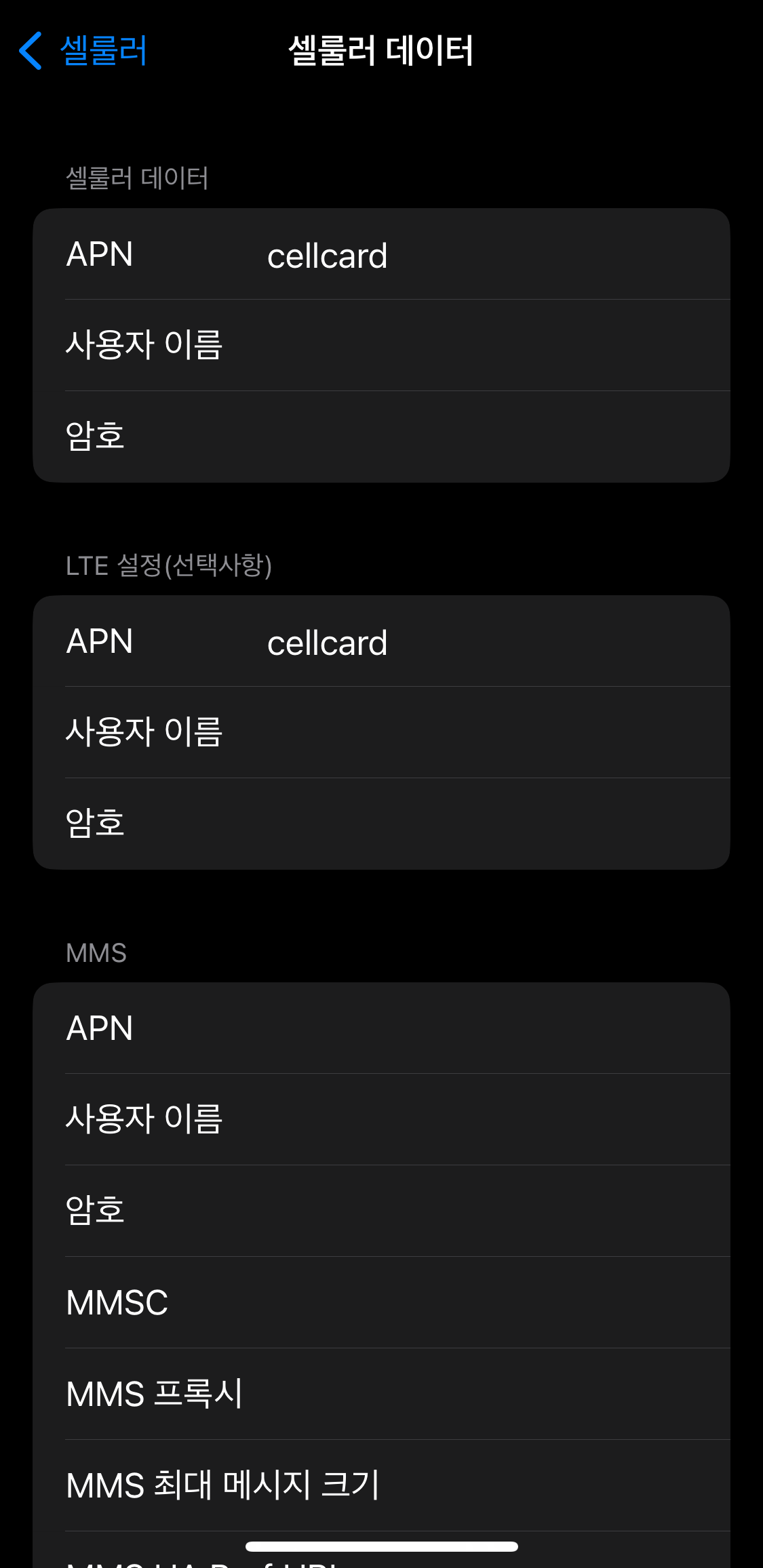 설정-셀룰러-셀룰러데이터 네트워크에 들어가 보니, 아래와 같이 내 폰은 텅 비어있었다. APN 부분에 아무것도 적혀있지 않았다.
