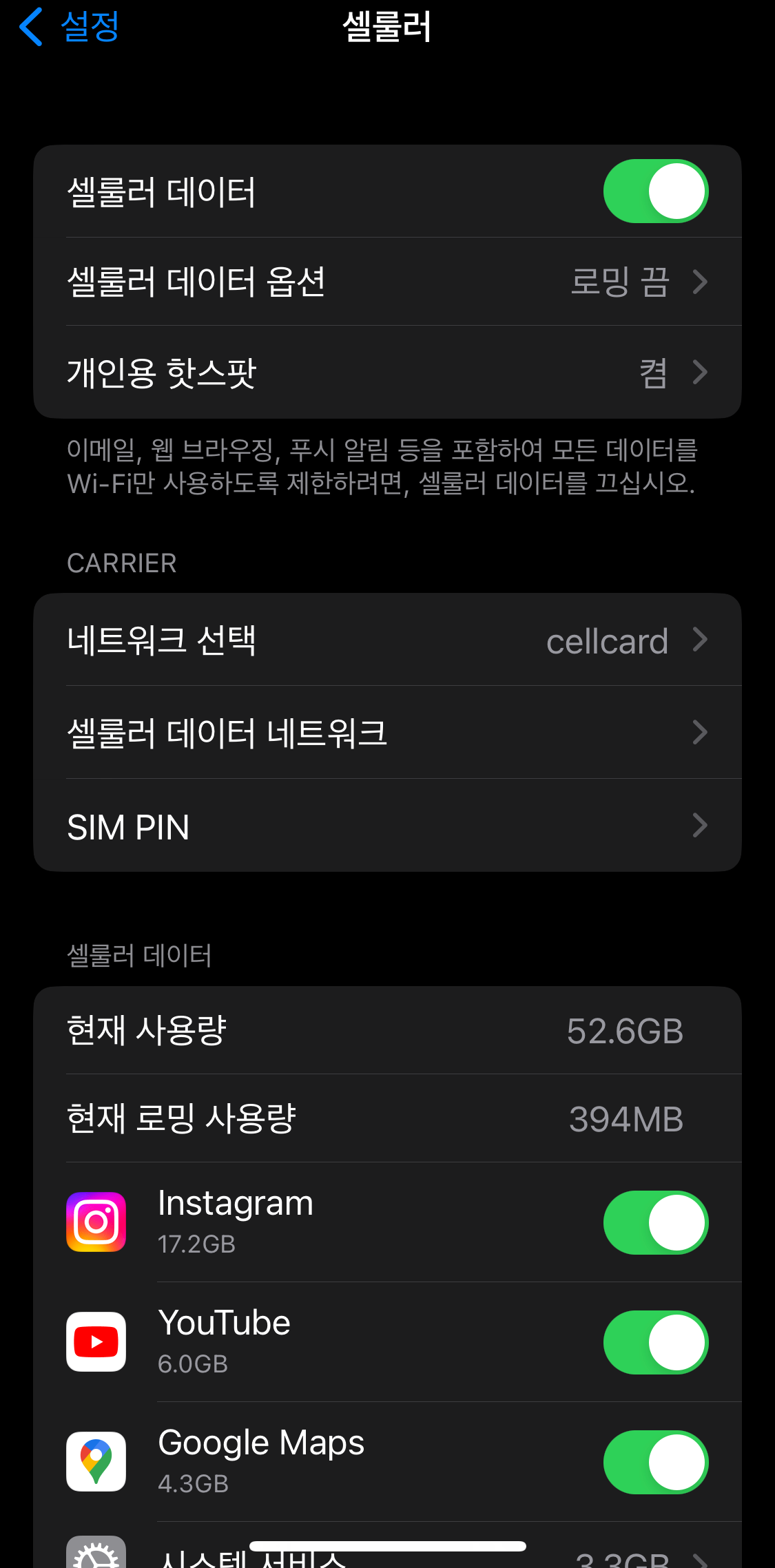 설정-셀룰러-셀룰러데이터네트워크에 들어가