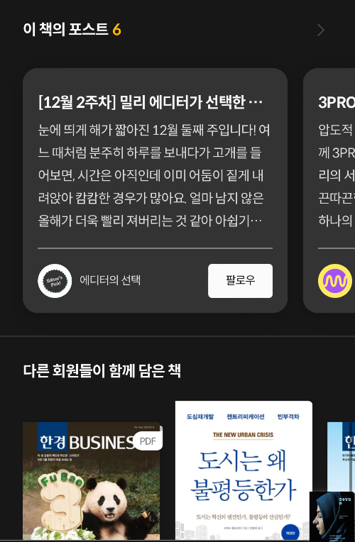 밀리의 서재는 독자들끼리 한 줄 리뷰를 공유하고, '이 책의 포스트'라는 기능도 있다. 그리고 원한다면 회원끼리 팔로우를 할 수 있도록 기능을 넣어 놓아 의지가 있는 이라면 리뷰를 남기는 다른 사람과 소통도 가능하다.