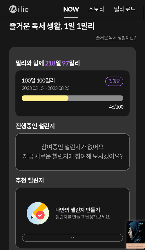 밀리의 서재에는 읽기 챌린지라는 기능도 있다. 새로운 책을 열면 포인트가 쌓이는 챌린지다. (이 포인트는 어디에 쓰는 건진 모르겠다. 그냥 모이니까 그런가 보다 하고 있다. 개인적으로는 별 관심 없음.)