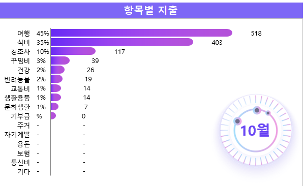 10월에는 9월보다 약 40달러 더 저축했다! 그러나... 전체 지출은 마이너스가 났다는 점...^^... 그래도 저축을 위한 노력, 칭찬해!