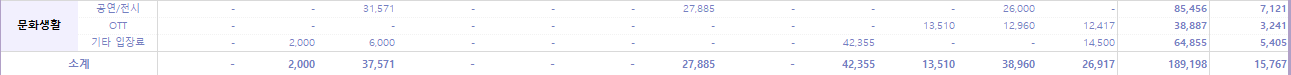한국에 있는 동안 남편과 함께 영화관을 두 번 갔다. 그 외 자잘하게 친구들과 놀면서 지출한 자전거 대여비용과, 인생 네 컷 지출이 있었다.