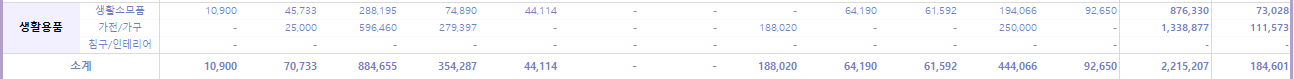 월평균 18.4만 원의 생활용품 지출을 했다. 물론 가전/가구의 지출이 가장 컸다.