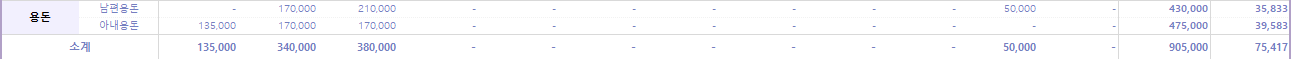 1~3월, 한국에 있는 동안 남편과 나는 각자 용돈을 받아 개인적인 지출을 해결했다. 11월에 잠시 한국에 들어갔을 때 남편에게는 5만 원의 개인용 돈을 주었다.