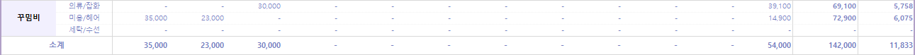 꾸밈비 지출은 한국에 있는 동안만 발생했다. 1~3월에 남편 이발한 비용, 그리고 11월에 잠시 한국 들어갔을 때 내가 쓸 겸 선물할 겸 산 화장품 지출이 전부다.