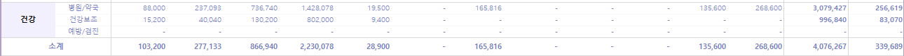 월평균 건강지출은 33.9만 원이었다. 도수치료로 100만 원 넘게 썼다. 실비 보험이 있어 다행이다. 안 아픈 게 최고인데... 내년에는 건강 지출이 줄어들면 좋겠다.