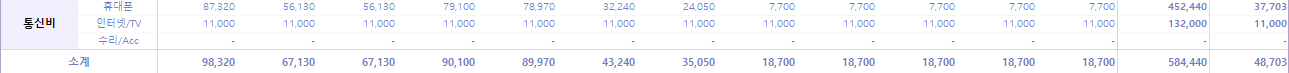 월평균 통신비는 4.8만 원이었다. 이중 1.1만 원은 월세입자가 내는 돈이니, 엄연히 따지자면 우리의 월 통신비는 평균 3.7만 원 정도인 셈이다. 남편도 나도 알뜰폰으로 바꾸었으니 내년 통신비는 이보다 낮아질 예정이다.