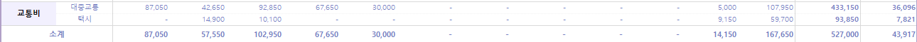 1~3월 동안 한국에서 이용한 대중교통 비용이 5월까지 빠져나갔다. 그리고 11월 중 잠시 한국 방문 때 사용한 교통비는 약 18만 원이었다.