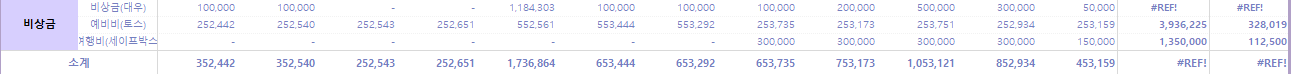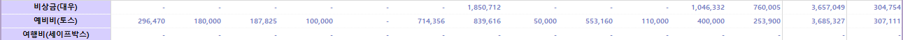비상금과 예비비는 월평균 30만 원씩 모으고, 필요시에 지출했다. 예비비와 비상금 지출은 아래와 같다.