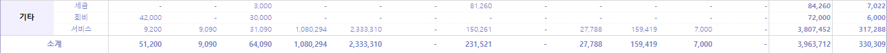 3,4,7,10월에 기타 비용으로 지출된 돈은, 전달에 벌어들인 돈 보다 쓴 돈이 더 많아 펑크 난 금액을 메꾼 흔적이다. 😥 외벌이 인생은 참 빠듯하다.