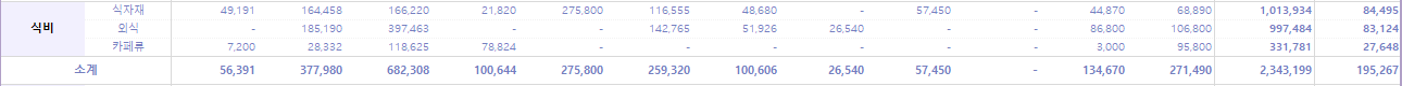 한국에서 쓴 월 평균 식비는 19.5만 원. 그러나 캄보디아에서 한 달에 100만 원씩 식비를 쓴 적도 있다는 점... ㅎㅎㅎㅎ
