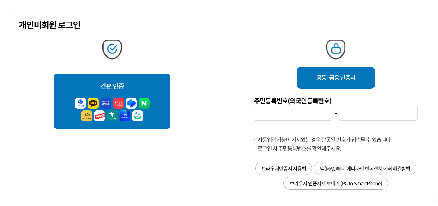 2. '개인 비회원 로그인' 클릭 후, 각자의 간편 인증 방식으로 로그인한다.