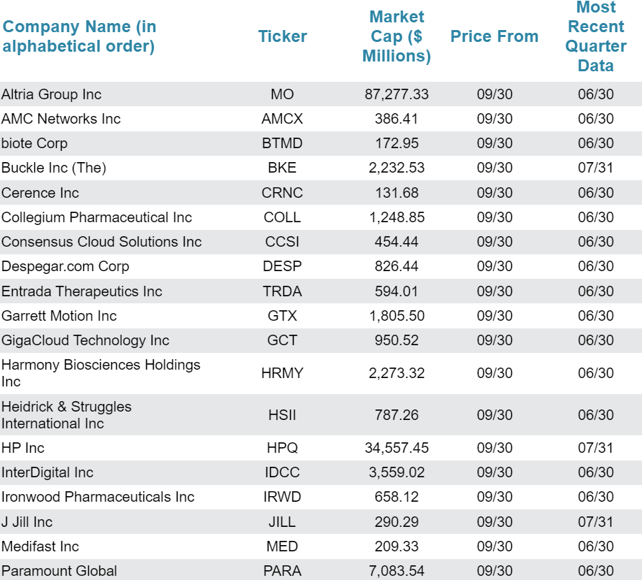716.49달러를 가지고 다시 마법공식 투자를 시작한다. 10월 1일을 기준일로 잡아 좀 더 꼼꼼하게 관리해보려고 한다. 10월 1일 기준 마법공식 리스트 (시가 총액 100만 달러, 30개 기업 검색)에 올라있는 기업은 아래와 같다.