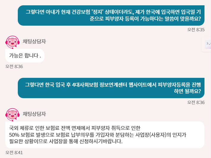 이번에 남편만 혼자서 한국에 들어가게 되었는데, 한국에 들어가자마자 건강보험 혜택 적용을 받을 수 있는 것인지 궁금해서 건강보험공단에 문의를 해봤다.