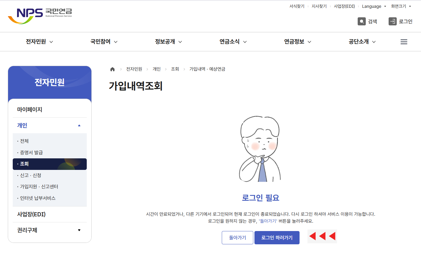 2. 국민연금공단 홈페이지 메인으로 가지말고, 위에서 두번째 '가입내역조회'를 클릭한다.