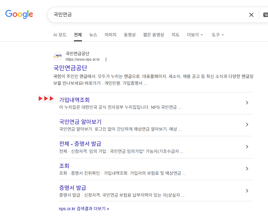 1. 구글에서 '국민연금'으로 검색한다.