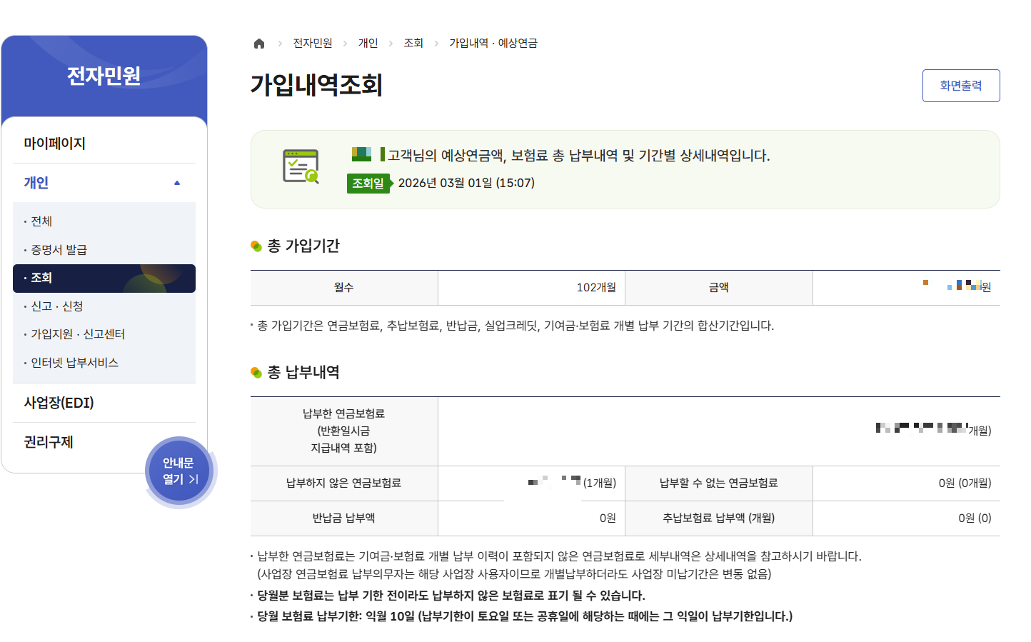 국민연금 총 가입기간, 국민연금 납입금액이 표에서 확인할 수 있다.