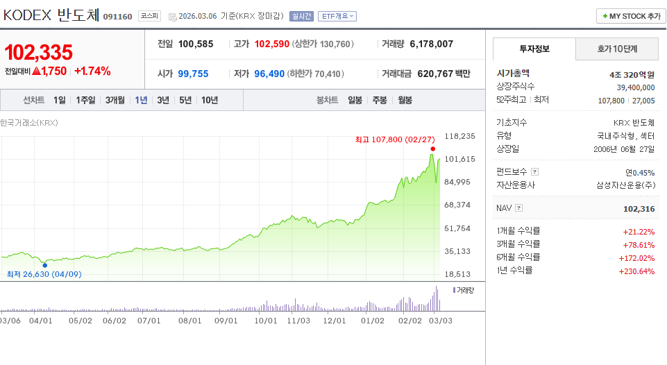 위에서 TIGER 반도체와 KODEX 반도체를 비교했던 기준을 그대로 적용해 보겠습니다.