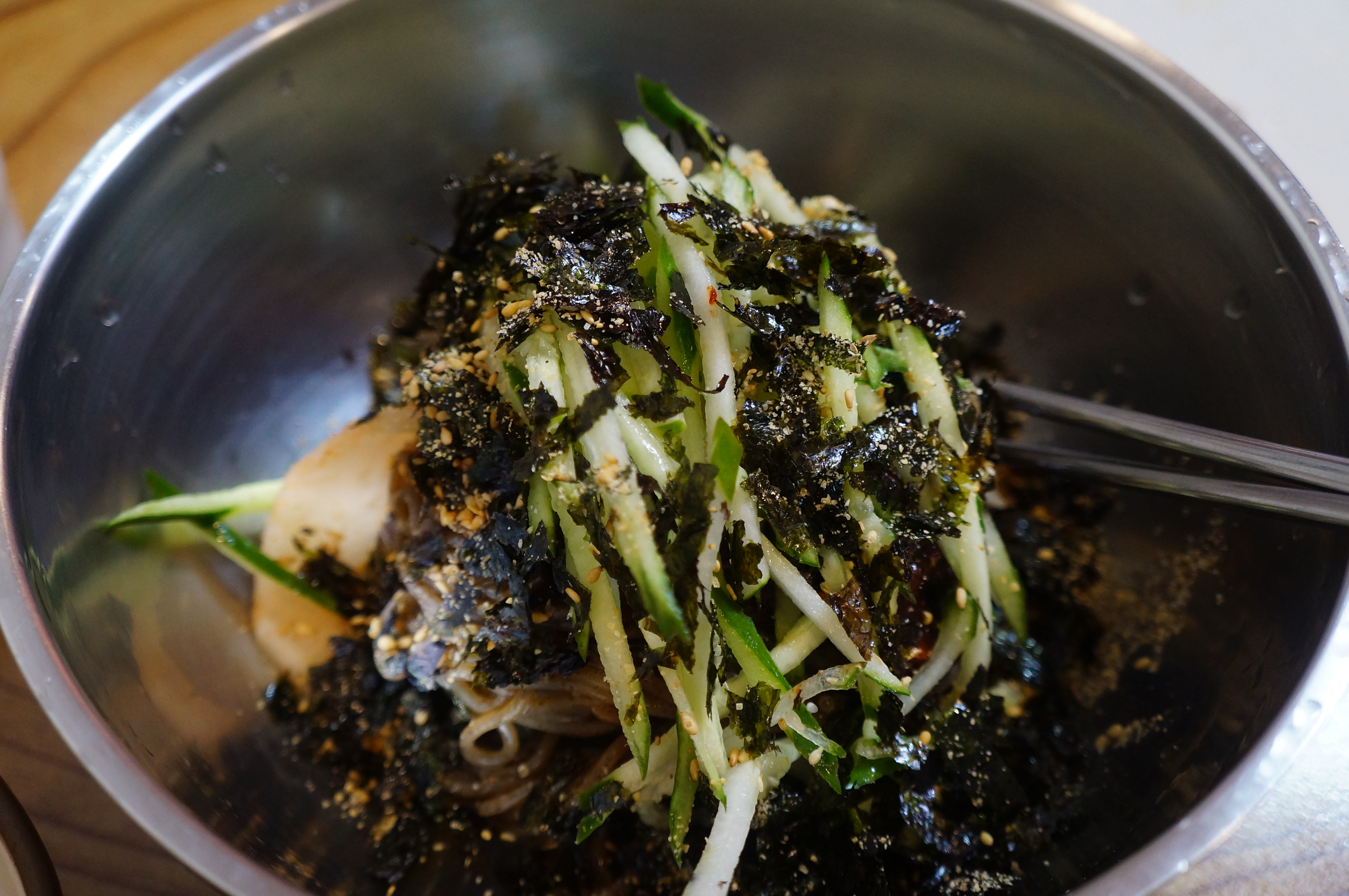 오이 고명과 김, 무가 듬뿍 올려져 있고, 참깨가 솔솔 뿌려져서 나왔다.