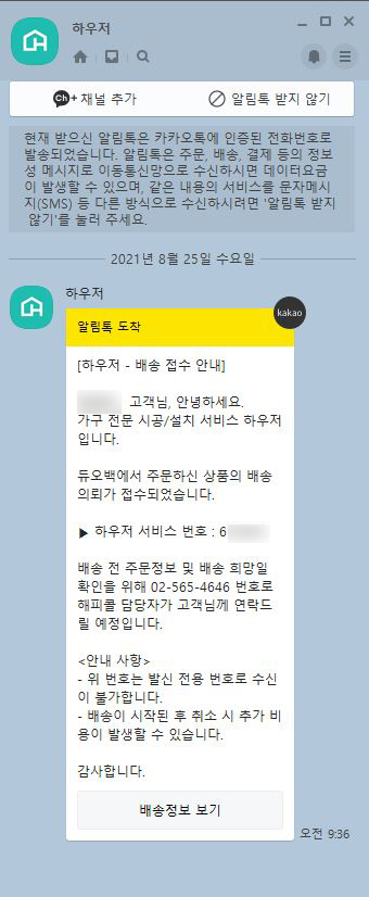 | 수요일 오후 | 카톡 받은 뒤, 02-565-4646 에서 전화와서 가장 빨리 배달 할 수 있는 날짜를 알려주시며 배달 일정으 조율 함. 제일 빠른 날이 금요일이라서 나는 금요일에 배달 해달라고 했음. |