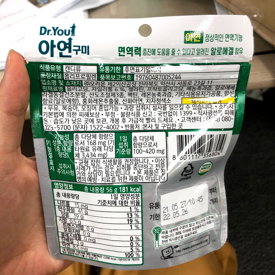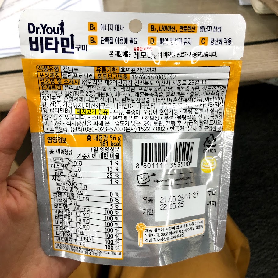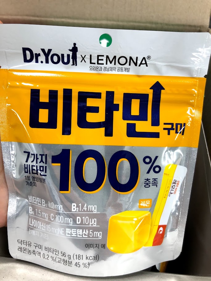 닥터유 비타민 구미는 특별히 오리온과 경남제약이 공동개발했다고 한다. 어려서부터 많이 먹던 레모나가 이 비타민 구미에 들어갔나 보다. 다른 구미에는 공동개발했다는 내용이 안 쓰여 있는데, 비타민 구미에만 쓰여있다.