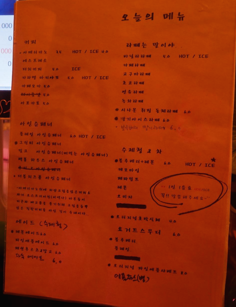 카페 백번의 봄에서는 다양한 음료를 주문할 수 있습니다. 1인 1음료를 주문해야 합니다.