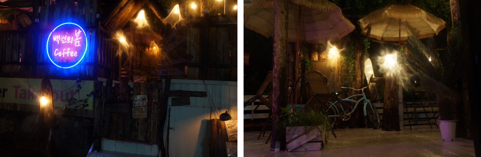 백번의 봄 외부는 발리 풍으로 꾸며져 있습니다. 카페 외부에도 좌석이 마련되어 있어서 외부 착석도 가능 합니다. 하지만 저희가 간 날은 비가와서 외부에는 앉을 수가 없었습니다. 날씨 좋은 선선한 저녁에 오면 외부에 앉아 담소를 나누면 정말 좋겠다는 생각이 들었습니다.