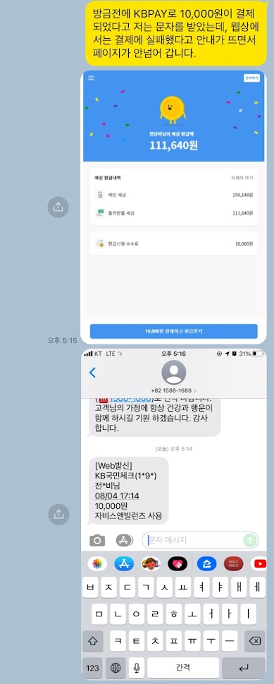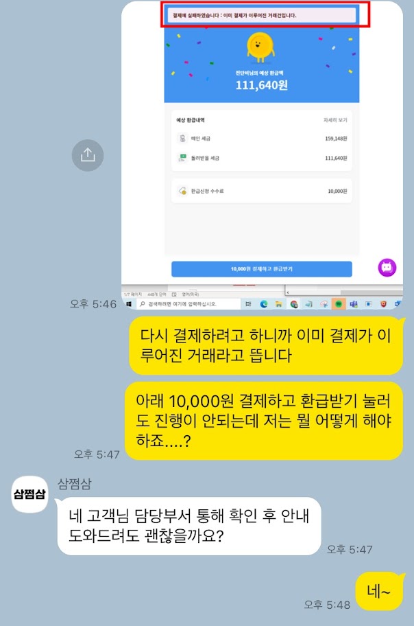 삼쩜삼 세금 환급 신청 중 '결제실패 오류', 해결 과정