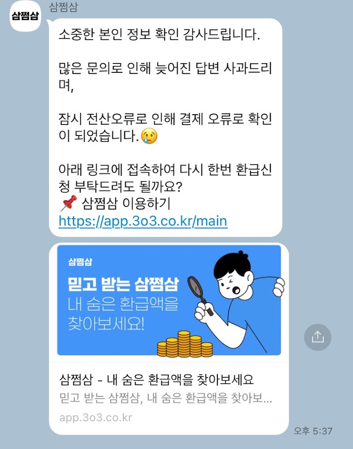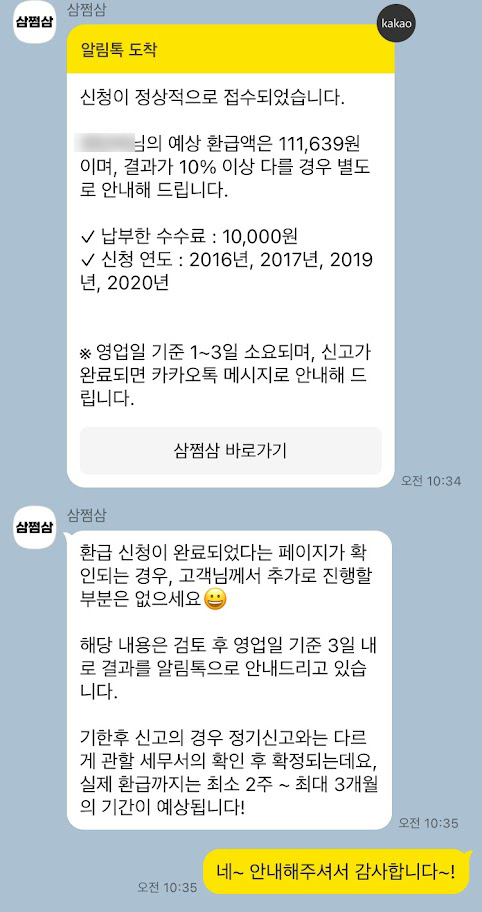 8월 5일에 삼쩜삼을 통해 환급 신청을 했다. 삼쩜삼에서는 신청이 정상적으로 접수되었다는 안내와 함께, 예상 환급액을 카카오톡으로 알려주며 짧게는 2주 최대 3주까지 소요된다고 안내했다. 그래서 오래 걸리겠거니 생각하고, 그동안 그냥 잊고 살았다.