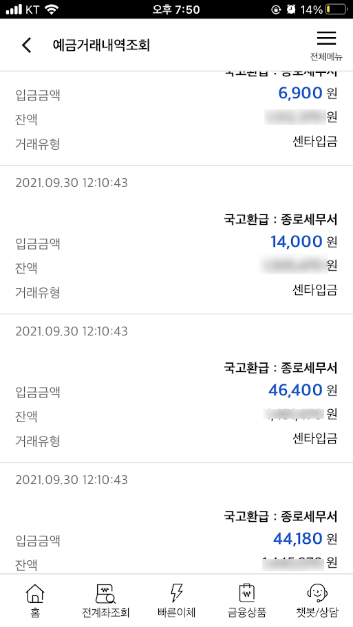 9월 30일에 세금 환급금이 이체되었다는 안내였다. 실제로 은행 앱에 들어가서 확인해보니 4건에 걸쳐 환급금이 들어와 있었다.