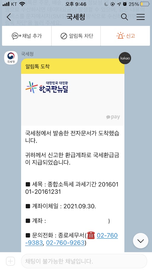 그러다가 10월 1일, 국세청에서 카톡이 왔다. 국세청에서 카톡 받아보기는 또 처음이었다.