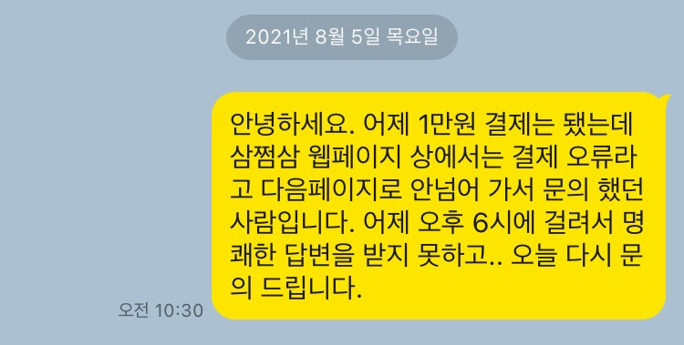오류 증상은, 분명 결제정보를 모두 입력해서 내 체크카드에서는 돈이 빠져나갔는데 삼쩜삼 홈페이지에서는 결제실패라고 뜨는 증상이었다.