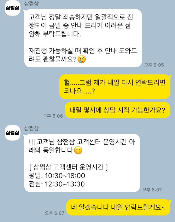 퇴근시간이 다가오고 있어서 마음이 급했다. 다시 삼쩜삼에 안된다고 문의를 했지만, 하필 상담 서비스 종료 시간이 되어 문제 해결을 할 수 없었다.
