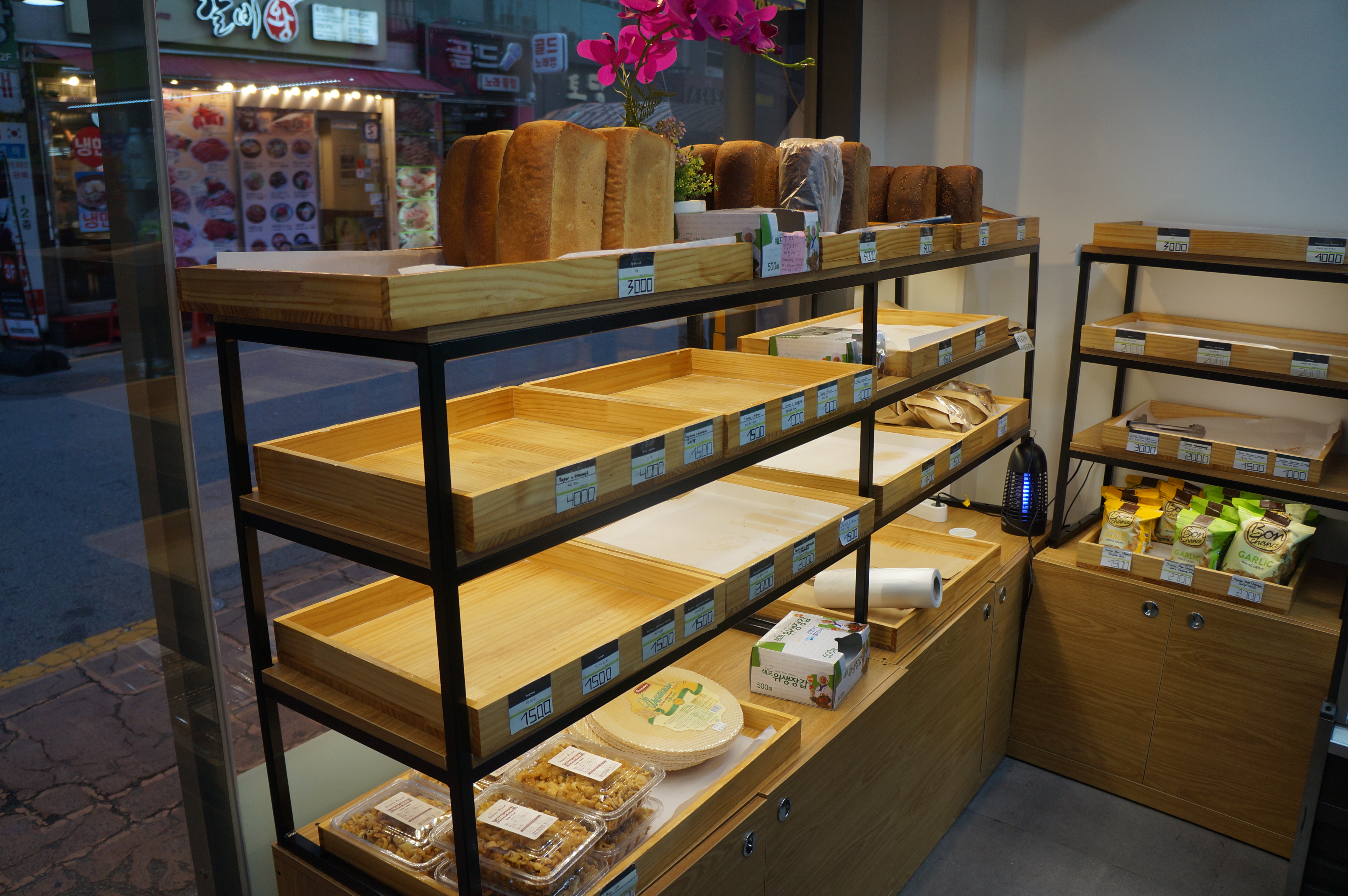 저희가 방문한 시간은 저녁 7시쯔음이라서, 하루 종일 빵이 팔리고 난 후였습니다. 그래서 빵 선반은 텅텅 비어있어요. 제일 윗줄에 식빵류가 좀 남아있네요.