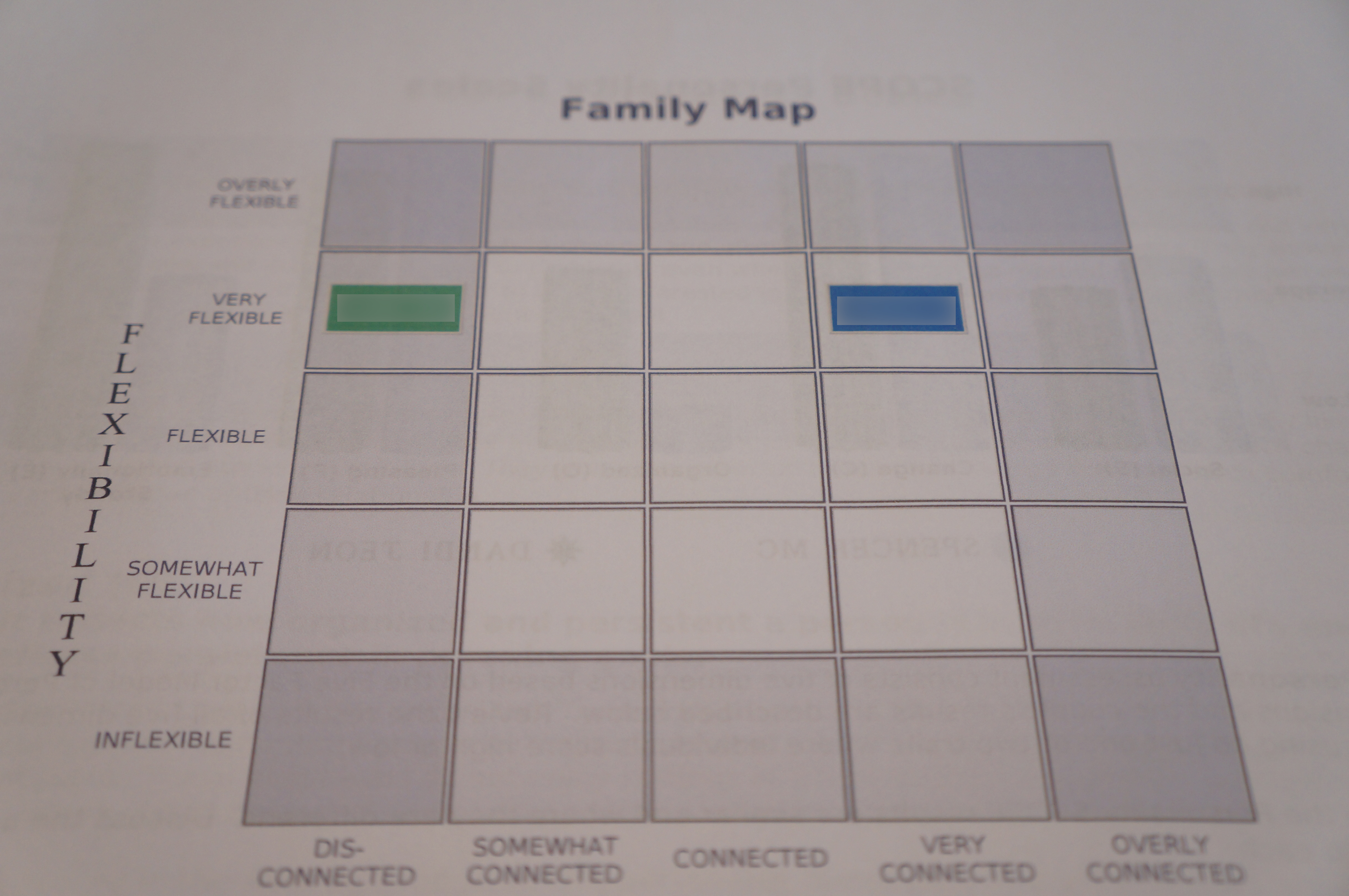 초록색이 나, 파란색이 남편인데, 우리 가족과 남편 가족(미국 시댁) 모두 VERY FLEXIBLE한 가족이지만, 우리 가족은 DIS-CONNECTED 인 반면, 남편 가족(미국 시댁)은 VERY CONNECTED한 가족임이 검사에서 드러났다. 거의 극과 극의 가족배경을 가지고 있는거다. ㅋㅋㅋㅋ 무의식으로는 알고 있었지만 검사지로 받아보니 신기했고 웃음이 났다.